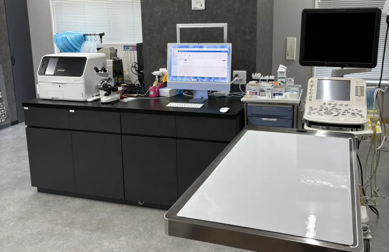 超音波診断装置や血液検査機器を設置した処置室では、動物たちの体に負担をかけずに、内臓の状態や病変の有無などを詳しく調べることができます。